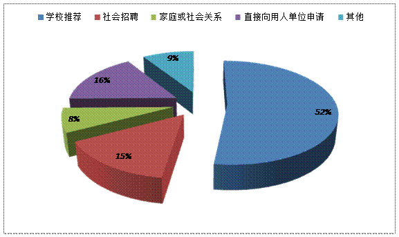 通過(guò)問(wèn)卷調(diào)查統(tǒng)計(jì)2016屆畢業(yè)生就業(yè)過(guò)程運(yùn)用的主要途徑分類(lèi):學(xué)校推薦52.3%;社會(huì)招聘15%;家庭或社會(huì)關(guān)系7.5%;直接向用人單位申請(qǐng)16.2%;其他9%。