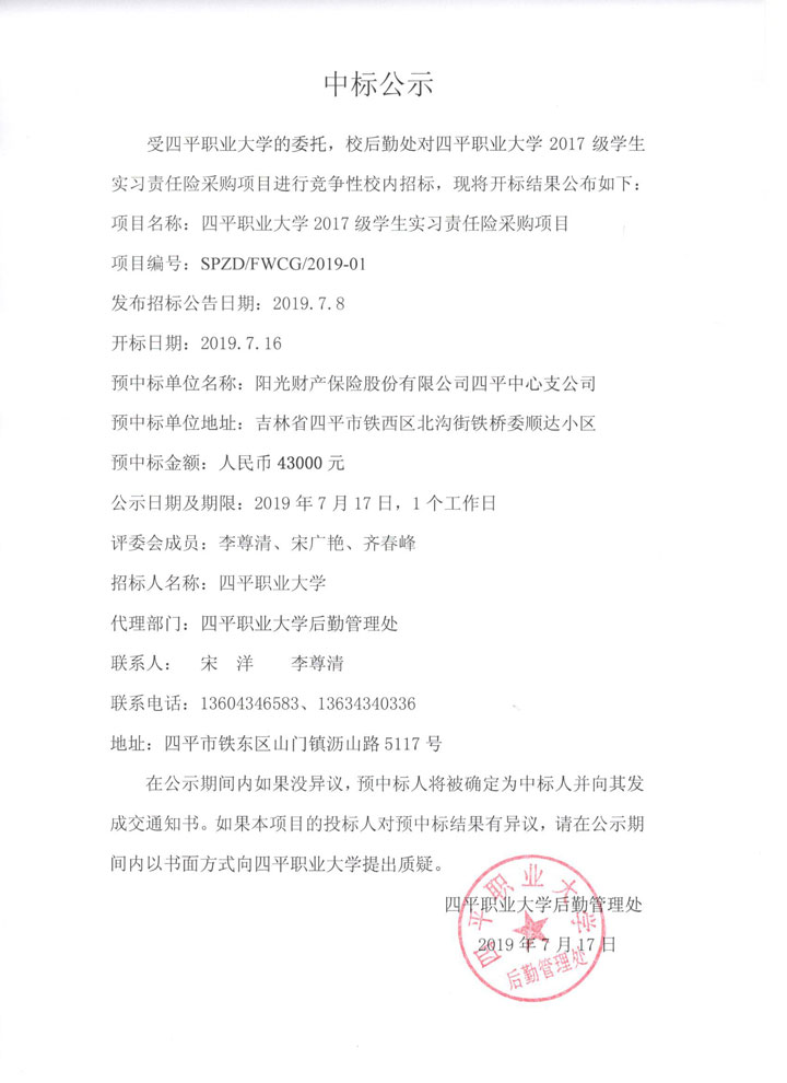 四平職業大學2017級學生實習責任險采購項目中標公示