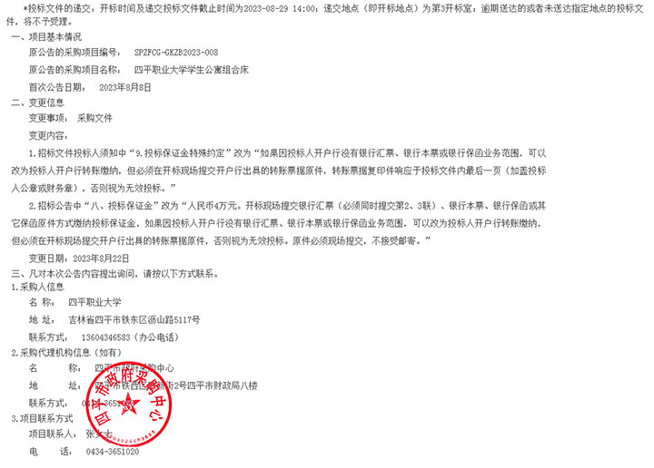 四平職業大學學生公寓組合床變更公告