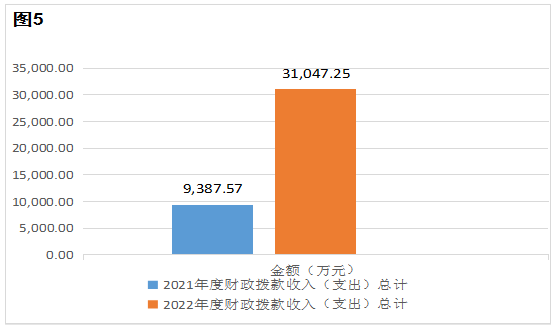 2022年度財政撥款收、支總計各31047.25萬元,與2021年相比,財政撥款收、支總計各增加21659.68萬元,增長230.7%。主要原因:2022年度增加專項撥款。圖5所示: