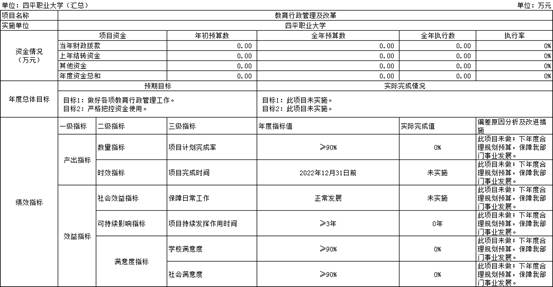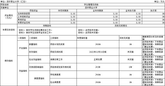 (2)根據年初績效目標,我部門一級項目“學生管理及資助”年初預算數0萬元,全年執行數0萬元,執行率0%。績效目標完成情況:此項目未實施。偏差原因分析及改進措施:此項目未做;下年度合理規劃預算,保障我部門事業發展。此項目自評得分0分。