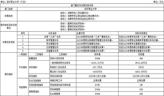 1、組織對2022年度部門預算“職業教育教學管理及條件改善”項目、“學生管理及資助”項目、“教育行政管理及改革”項目、“教育設施建設與發展”項目等4個一級項目進行了績效自評,共涉及資金97.7萬元,績效自評率為100%;組織對2022年度部門預算“校園零修及鍋爐維修維護項目”項目、“四平職業大學考試考務費項目”項目、“電費”項目等3個二級項目進行了績效自評,共涉及資金97.7萬元,績效自評率為100%。