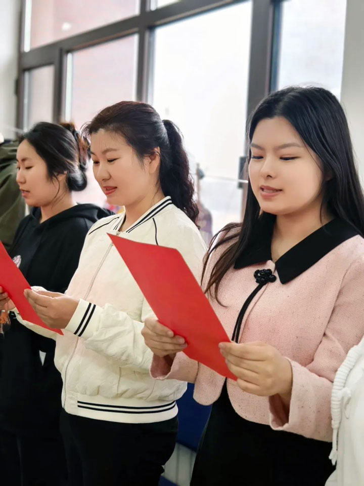 活動(dòng)高潮由黨辦副主任郝亞平老師領(lǐng)銜呈現(xiàn)。她手持話筒,以清越聲線誦讀林徽因經(jīng)典詩(shī)作《你是人間的四月天》。接著,50名教職工共同朗誦,最終拼合成完整的“四月畫卷”。當(dāng)指尖的漆香遇見(jiàn)詩(shī)句的芬芳,教育者的情懷在此共鳴。